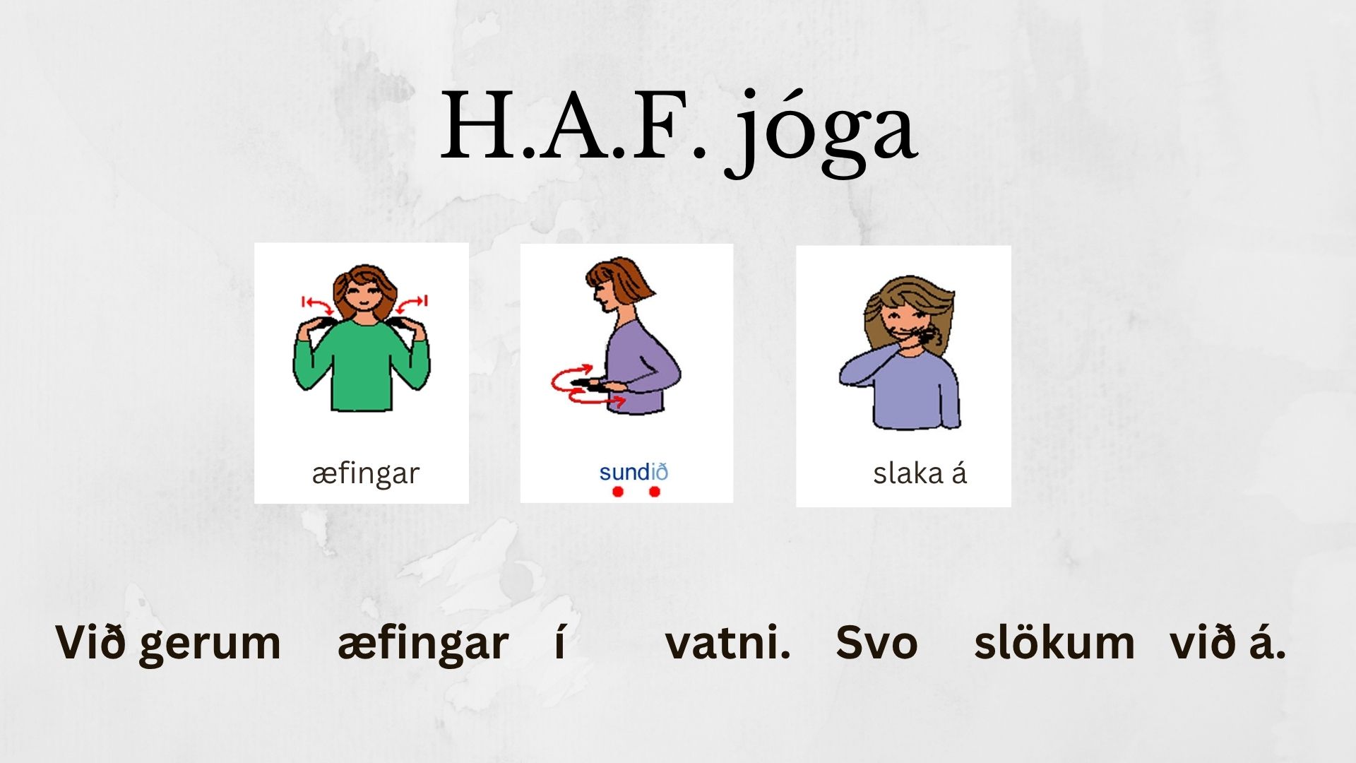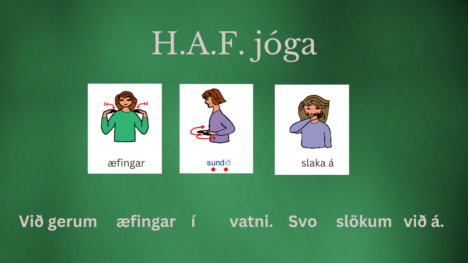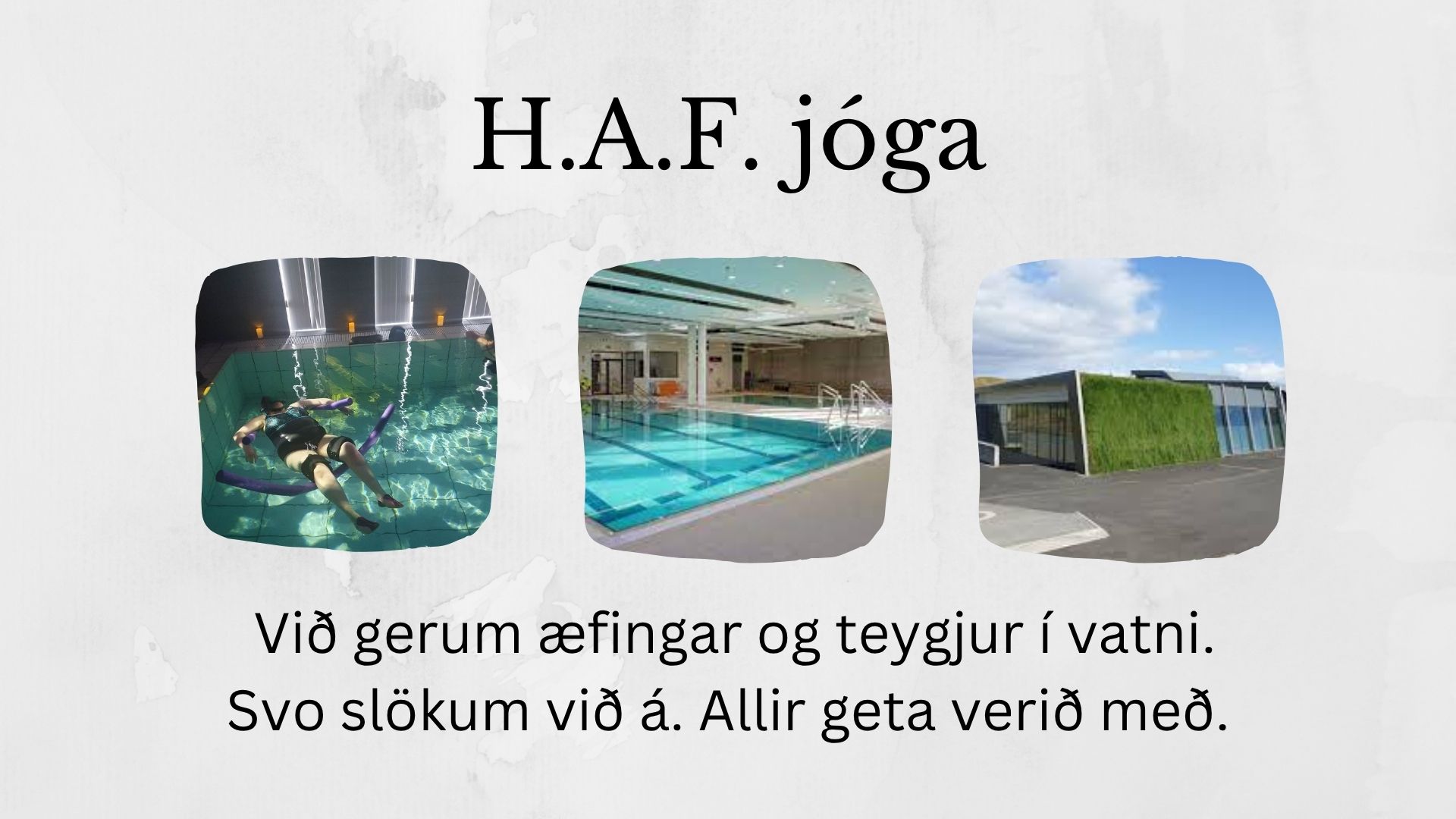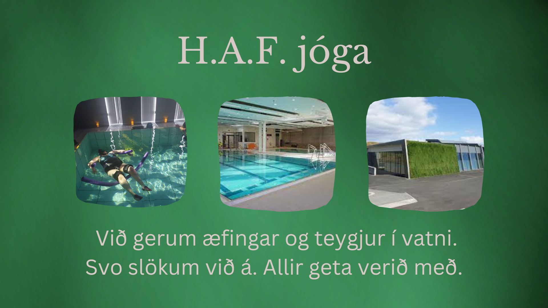 Lýsing: Við gerum æfingar og teygjur í vatni. Svo slökum við á. Allir geta verið með.