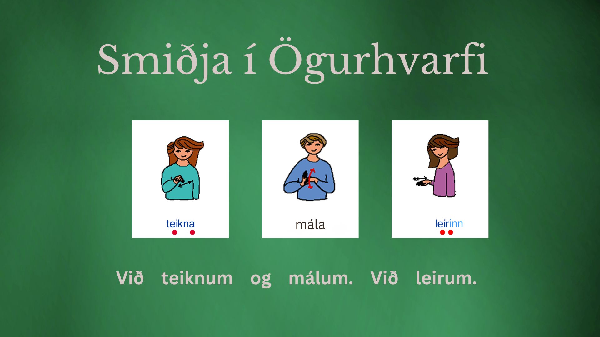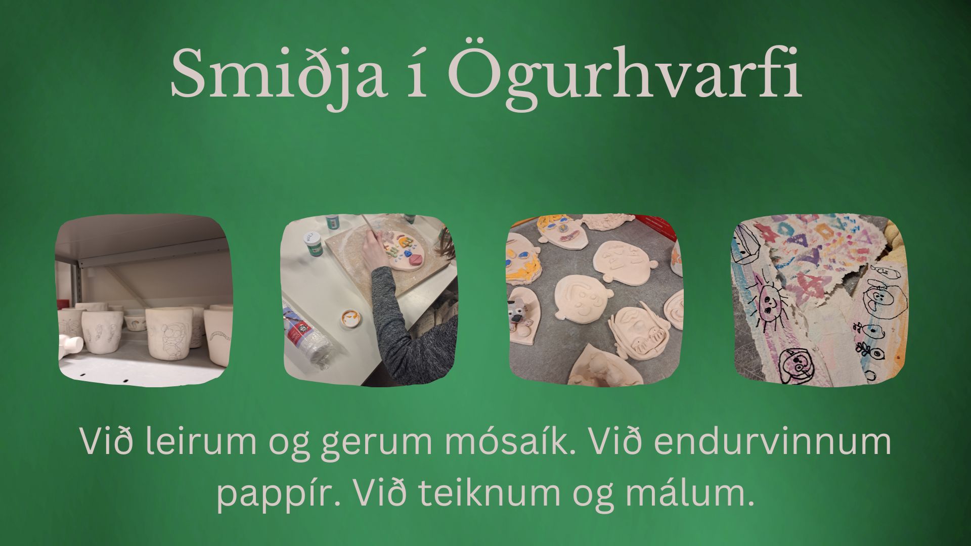 Lýsing: Við leirum og gerum mósaík.  Við endurvinnum pappír. Við teiknum og málum.