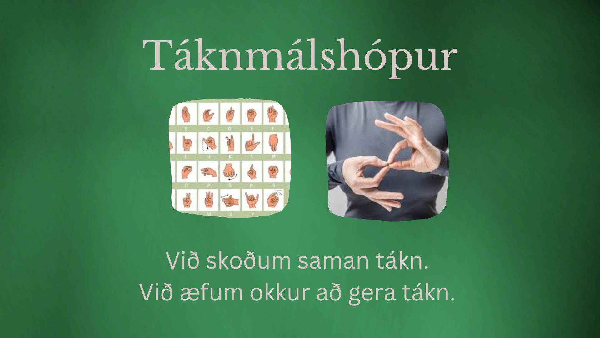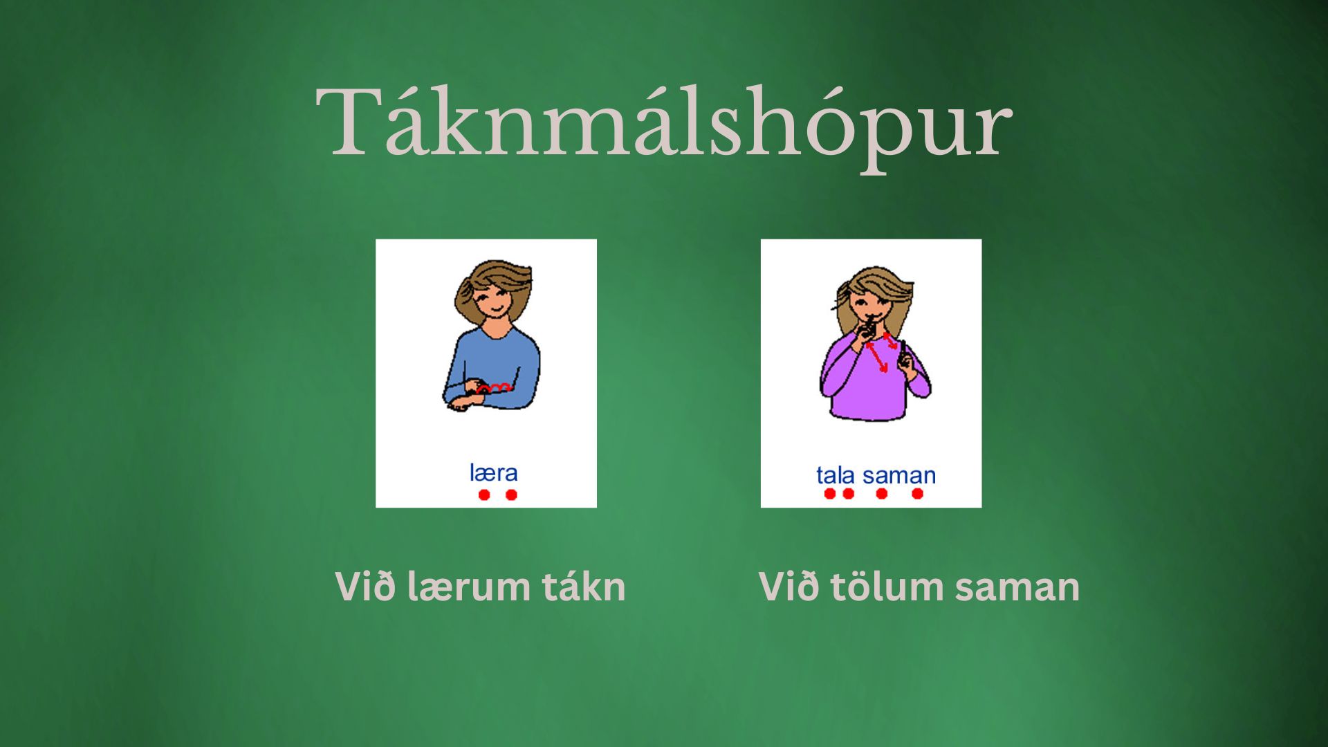 Lýsing: Við skoðum saman tákn. Við æfum okkur að gera táknin. Við notum táknin þegar við tölum saman í hópnum.